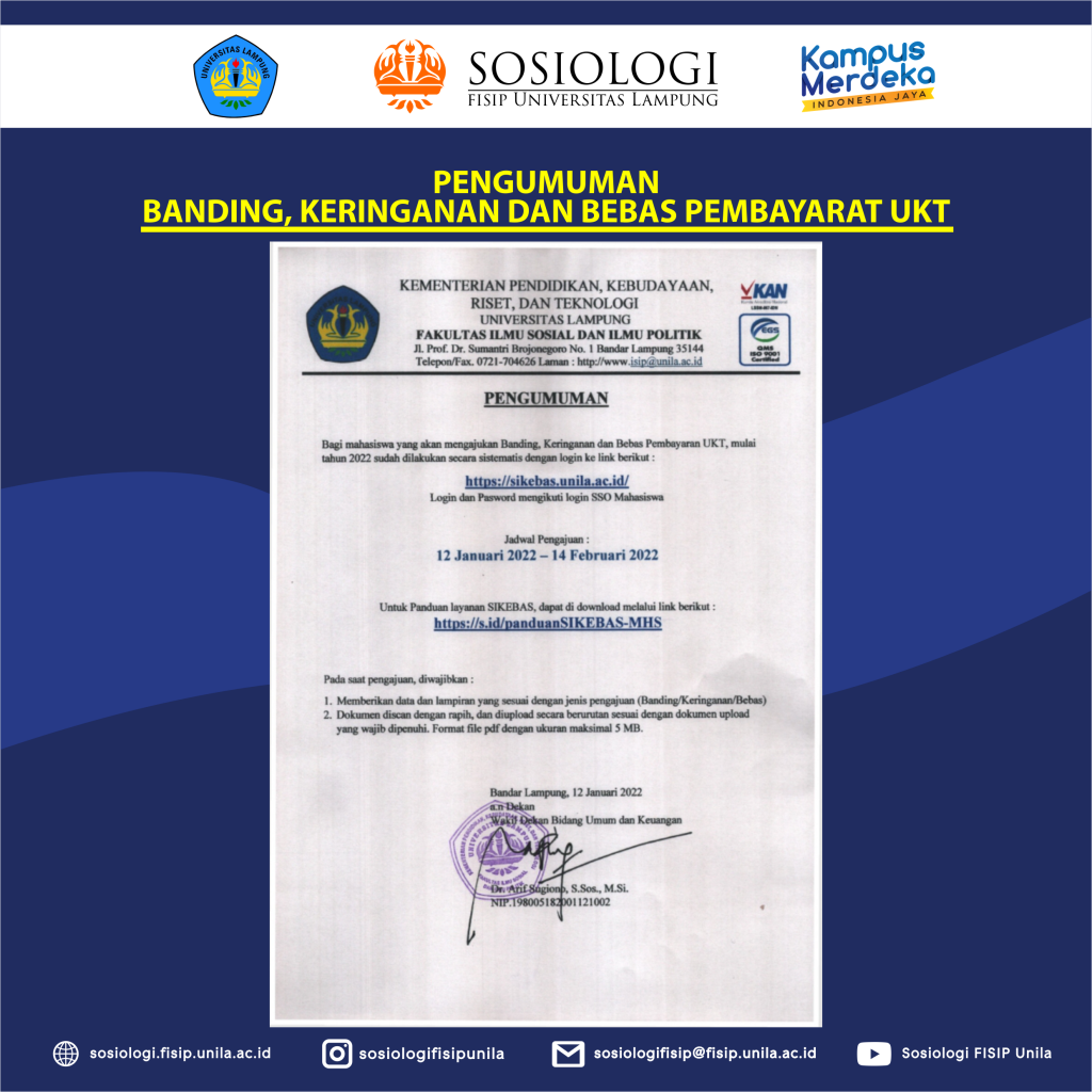 Mulai tahun 2022 untuk mengajukan Banding, Keringanan dan Bebas Pembayaran UKT melalui https://sikebas.unila.ac.id, Login dan Password menggunakan login SSO Mahasiswa. Jadwal pengajuan 12 Januari 2022 – 14 Februari 2022. untuk Panduan layanan SIKEBAS, dapat didownload melalui link berikut : https://s.id/panduanSIKEBAS-MHS