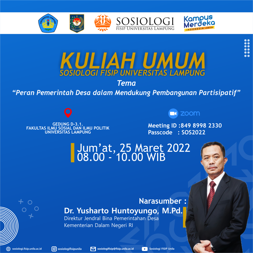 Bandar Lampung, (25/3/22) – Jurusan Sosiologi FISIP Unila menggelar kegiatan kuliah umum dengan tema “Peran Pemerintah Desa dalam Mendukung Pembangunan Partisipatif”, kegiatan ini dilaksanakan secara Hybrid pada Jum’at, 25 Maret 2022 di Ruang Sidang Rektorat Lantai 2 Unila dan Zoom Read more