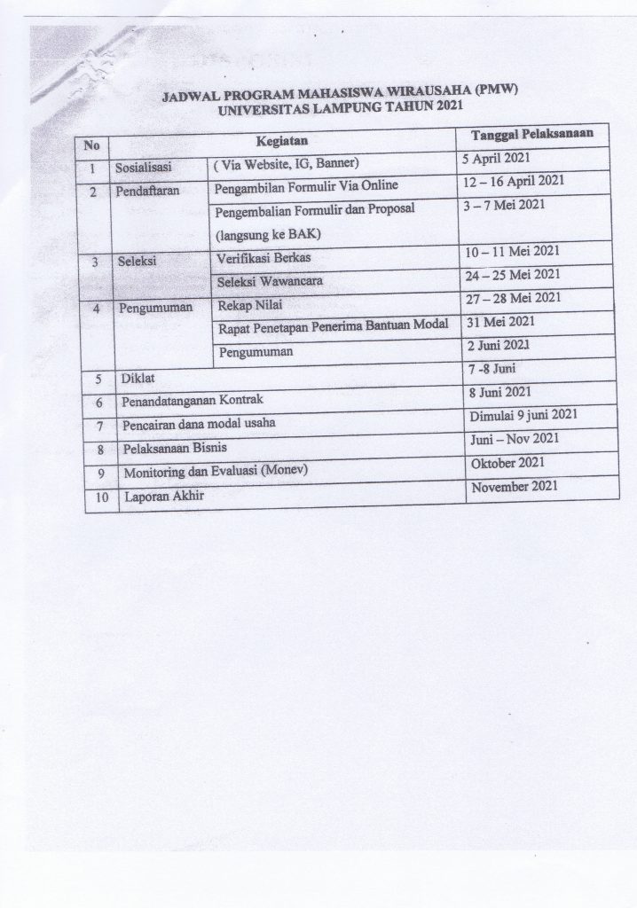 Menindaklanjuti surat dari Wakil Dekan Bidang Kemahasiswaan dan Alumni Universitas Lampung Nomor : 1647/UN.26/KM/2021, perihal Program Mahasiswa Wirausaha (PMW) Tahun 2021, kami informasikan kepada mahasiswa Jurusan Sosiologi FISIP Unila yang berminat mengikuti program tersebut untuk mendaftar dan melihat jadwal di atas.
