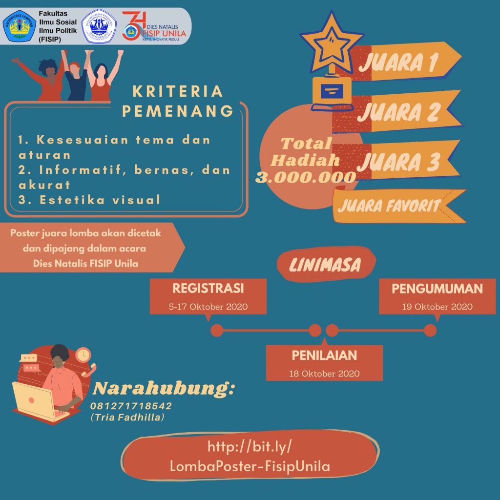 • Poster pemenang akan dicetak dan dipajang pada acara puncak Dies Natalis Fisip ke-34, dan diposting di media sosial Fisip dan Unila.