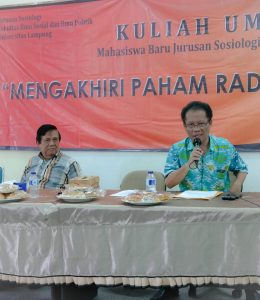 Mengawali perkuliahan Semester Ganjil 2017/2018, Jurusan Sosiologi FISIP Unila menggelar Kuliah Umum “Mengakhiri Paham Radikal Terorisme” khusus yang ditujukan untuk mahasiswa baru tahun angkatan 2017. Kegiatan yang dilakukan pada Jumat (8/9) tersebut melibatkan sekitar 110 mahasiswa baru Jurusan Sosiologi. Isu tentang paham radikal terorisme diangkat dan dikaji secara mendalam dengan menghadirkan narasumber Prof. Dr. Damrah Khair, M.A. Kajian tentang menangkal paham  terorisme ini menjadi isu dan bahasan hangat, oleh karenanya, mahasiswa baru perlu dibekali tentang pemahaman awal perihal cara kelompok teroris membangun jaringan terorisme.
